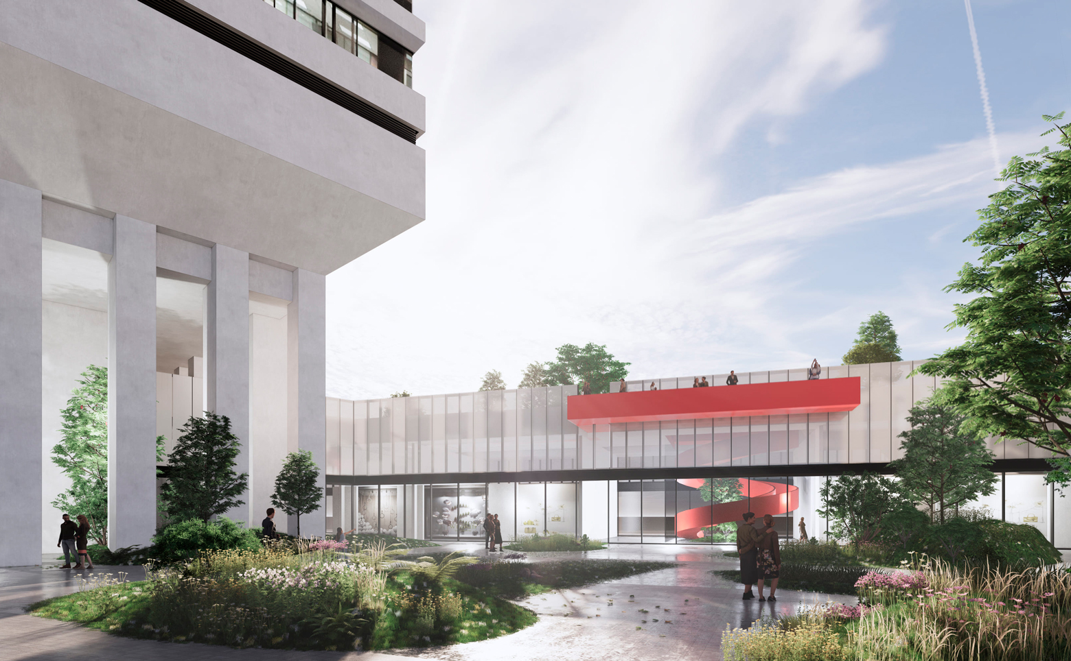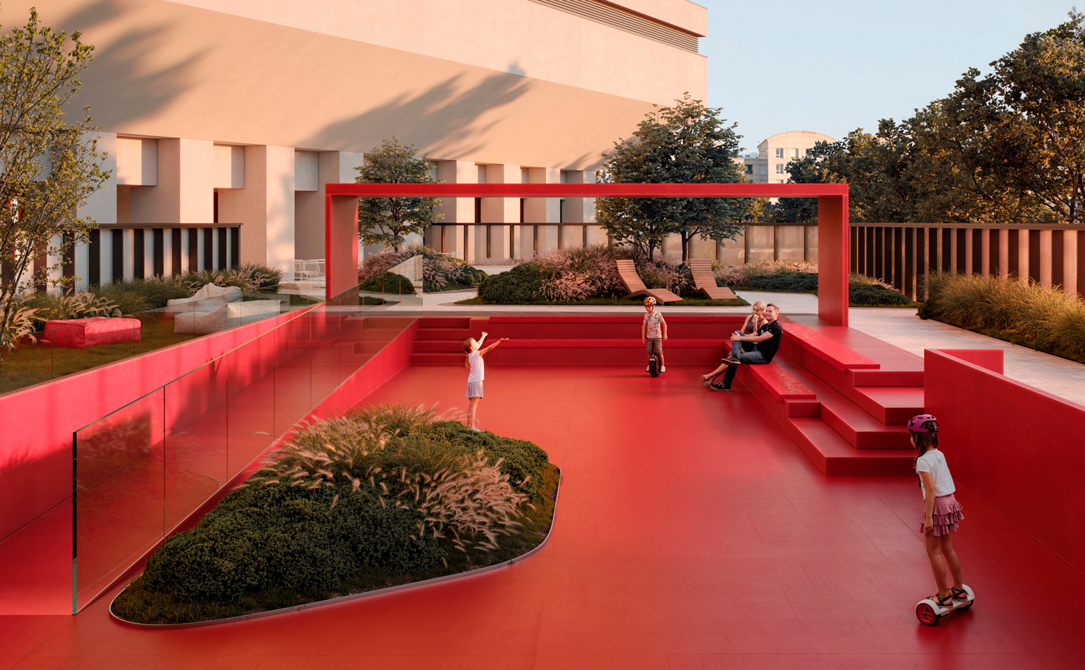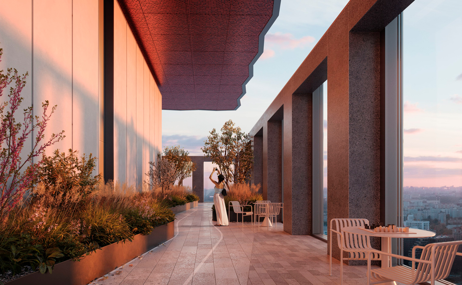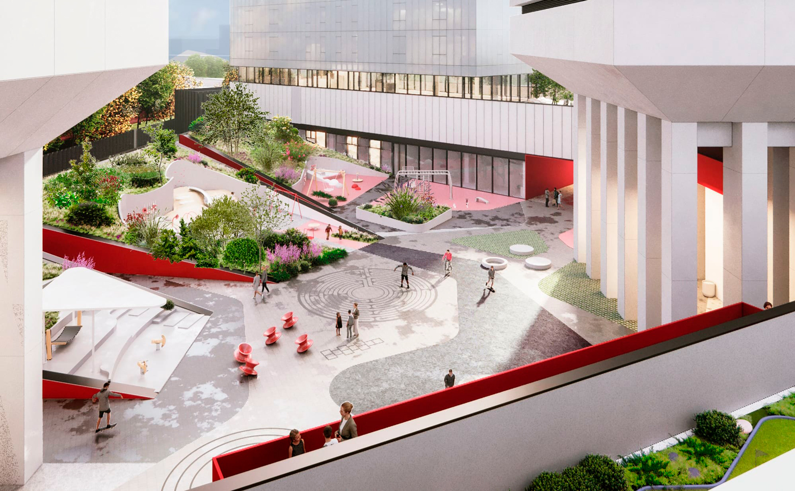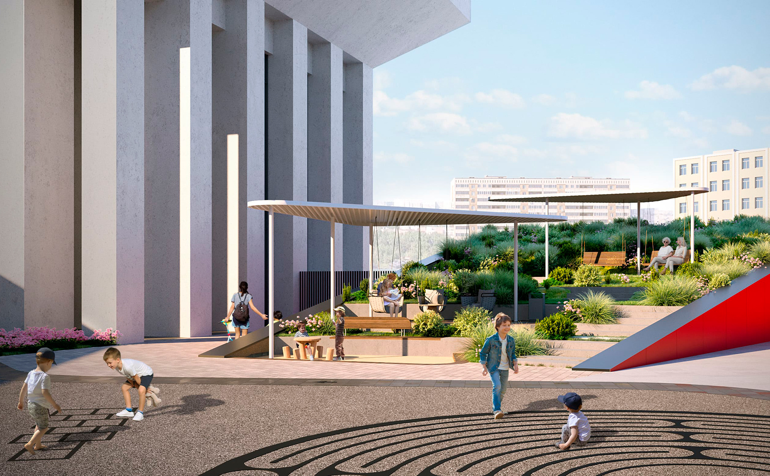 На закрытой территории комплекса выполнен ландшафтный дизайн с арт-объектами и круглогодичное озеленение, оборудованы детские площадки и зоны отдыха под открытым небом. Внутренний двор огорожен от городского пространства искусственным холмом с садом. На высоте 140 метров для жителей комплекса открыта смотровая площадка с панорамным видом на город. В общественно-деловом центре размещены офисы, концептуальный ресторан и фитнес-центр с бассейном.