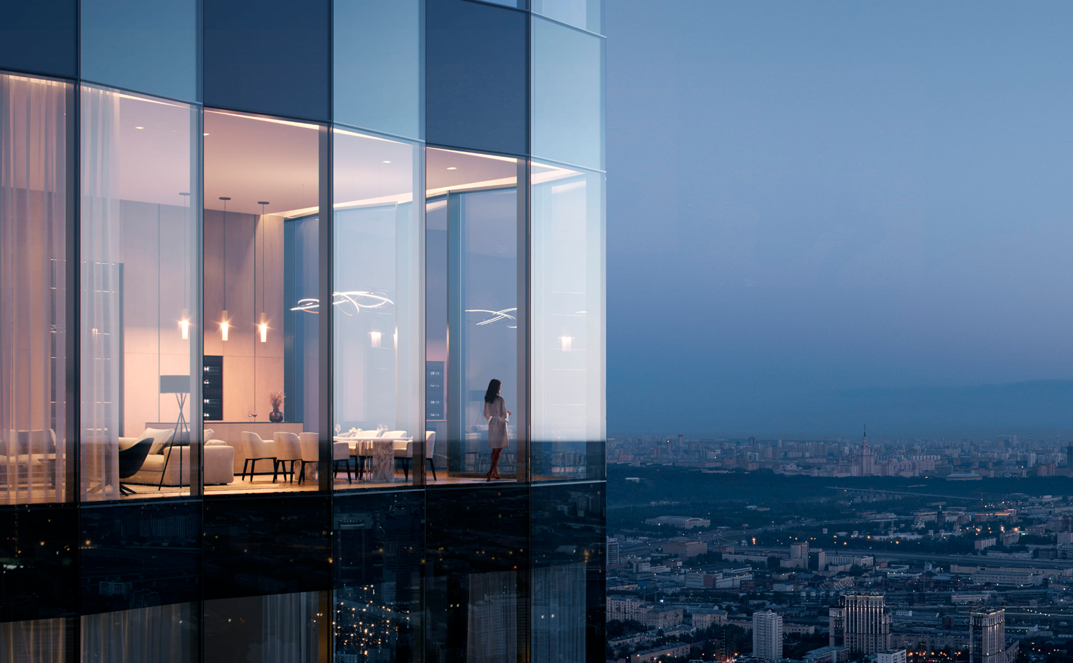 В ЖК предложено множество планировочных решений от студий до пятикомнатных квартир с высокими потолками до 4,5 метра и панорамным остеклением. На 40 и 41 этажах башни B размещены просторные видовые пентхаусы. Квартиры сдаются с отделкой White Box или с чистовой отделкой.