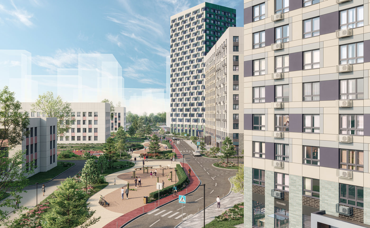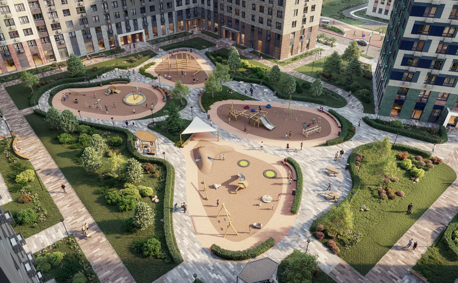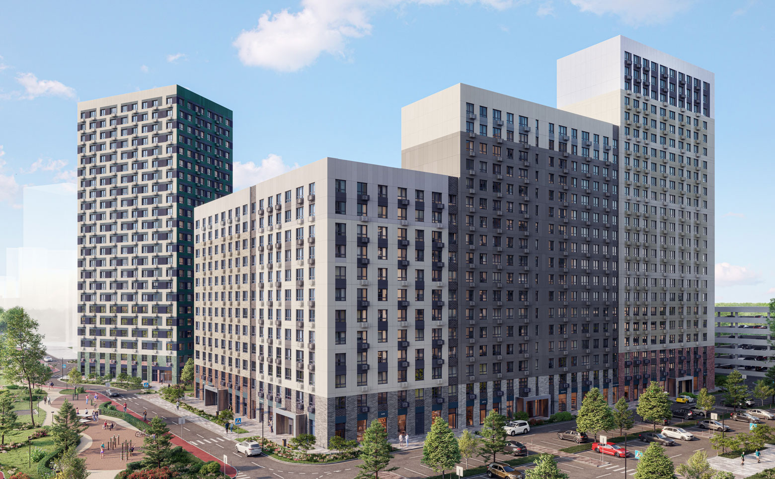 Территория комплекса благоустроена — имеются детские сады и школы, детские площадки, тихие зоны для отдыха и занятий спортом, велодорожки, собственный большой физкультурно-оздоровительный комплекс с бассейном. Ландшафтный дизайн выполнен международным бюро «Gillespies». Для автовладельцев предусмотрены открытые многоуровневые паркинги.