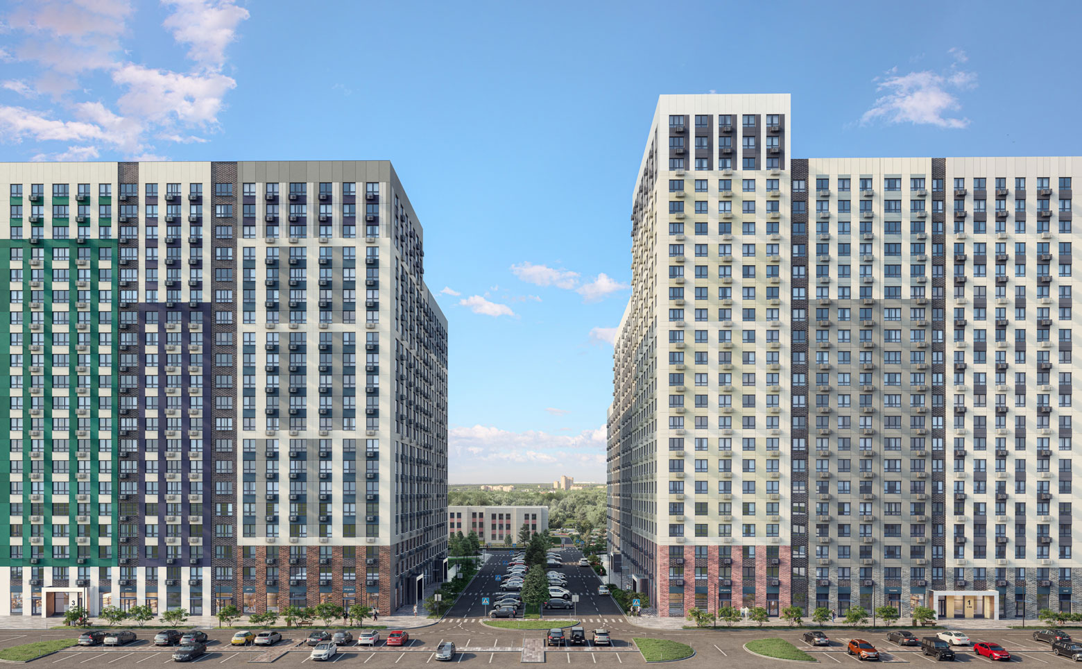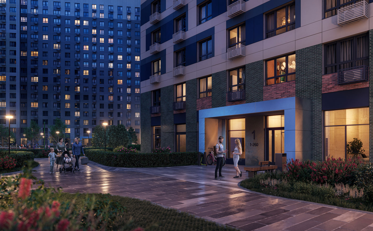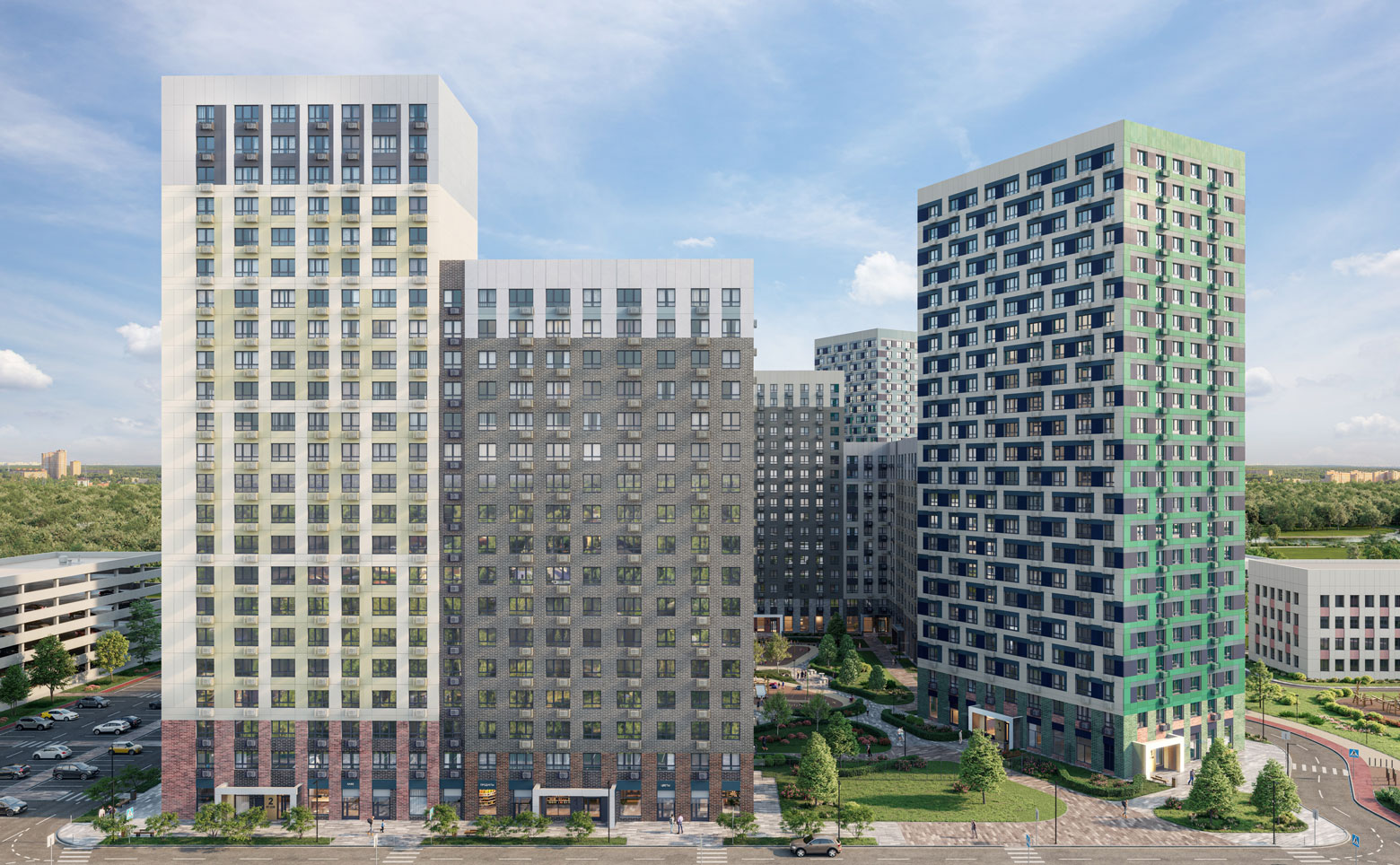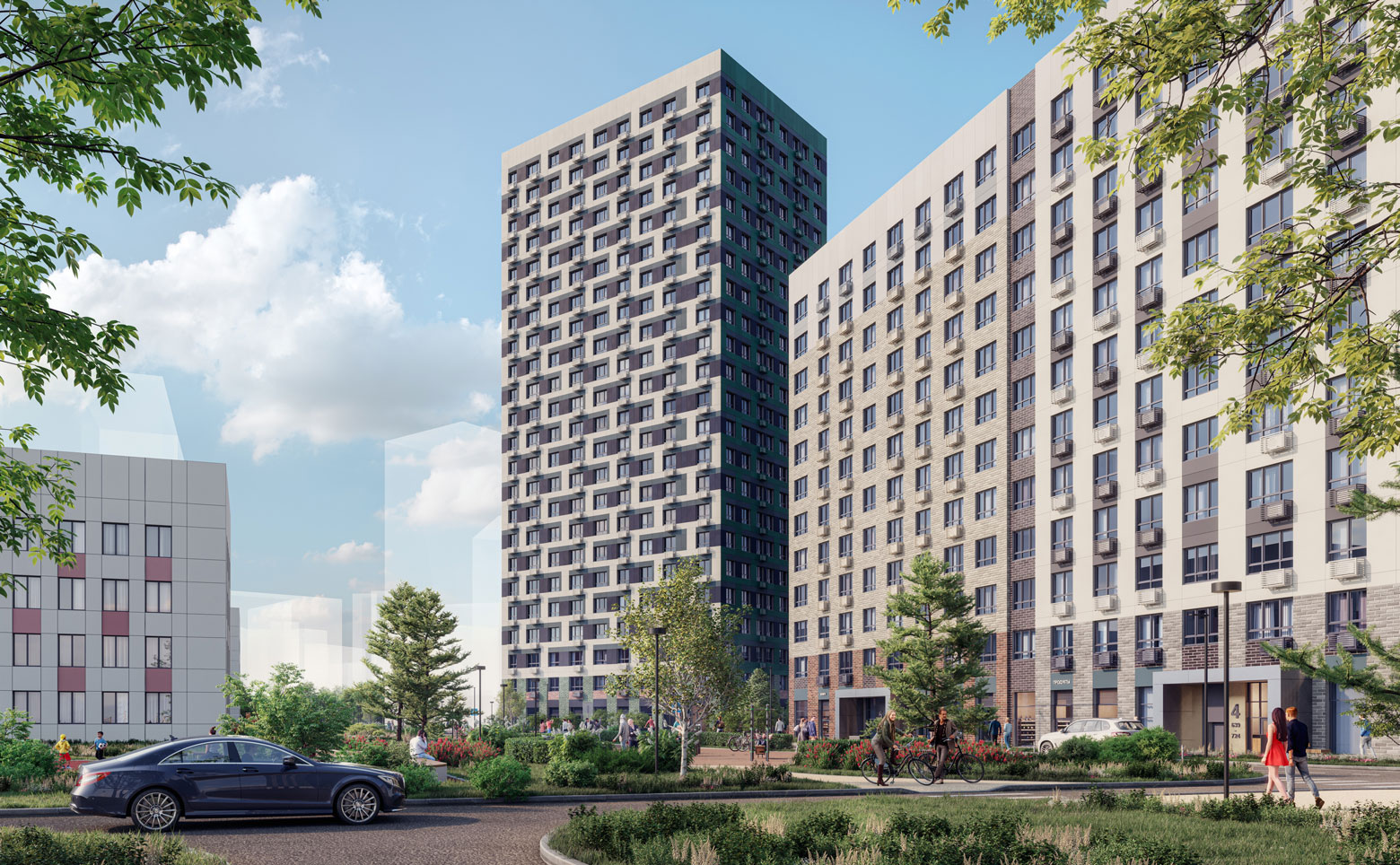 Территория комплекса благоустроена — имеются детские сады и школы, детские площадки, тихие зоны для отдыха и занятий спортом, велодорожки, собственный большой физкультурно-оздоровительный комплекс с бассейном. Ландшафтный дизайн выполнен международным бюро «Gillespies». Для автовладельцев предусмотрены открытые многоуровневые паркинги.